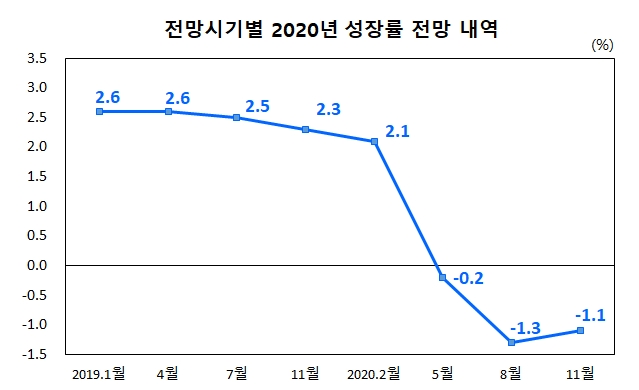 한국은행은 26일 올해 경제성장률 전망치를 -1.1%로 8월 전망치에 비해 0.2%포인트 올렸다.