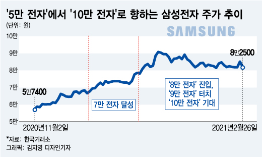 하지만 작년 11월부터 모든 게 달라지기 시작했다. 미국 대통령 선거에서 바이든 민주당 후보가 이기고 뒤이어 화이자-바이오엔텍(Pfizer-BioNTech)에서 개발한 코로나19 백신 효능이 90% 이상이라는 뉴스가 전해지면서 삼성전자는 ‘5만 전자’의 굴레를 완전히 벗어버리고 ‘6만 전자’에 안착했다. 그리고 12월 삼성전자는 사상 처음으로 ‘7만 전자’에 입성했다.