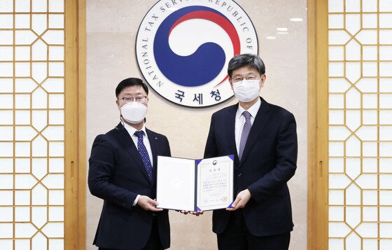 | 김동일 국세청 국제조세관리관(오른쪽)과 남재원 NH농협은행 부행장이 표창장을 들고 기념촬영을 하고 있다.(NH농협은행 제공)© 뉴스1 |