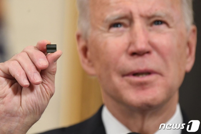 | 조 바이든 미국 대통령이 지난 2월24일(현지시간) 반도체 등의 공급망 검토를 지시하는 행정명령에 서명하기 직전 반도체 칩을 들고 연설하고 있다. /AFP=뉴스1 |