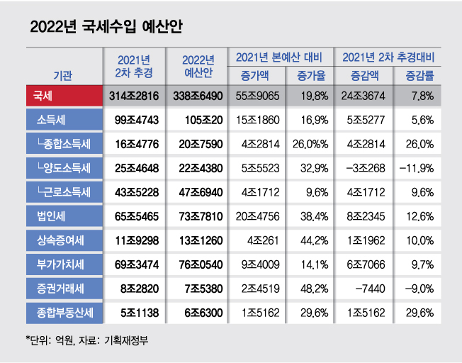 기획재정부가 31일 발표한 '2022년 국세 세입예산안'에 따르면 내년 국세수입 총규모는 338조6490억원으로 올해 예산(2차 추가경정예산 기준, 314조2816억원)대비 24조3674억원(7.8%) 증가할 것으로 추산됐다.