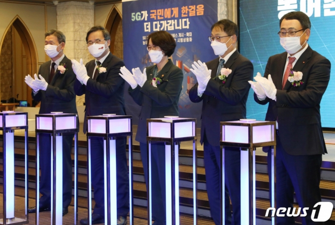 | 지난달 25일 오전 서울 여의도 CCMM빌딩에서 열린 지하철 Wi-Fi 28㎓ 백홀 실증 결과 발표 및 농어촌 5G 공동이용망 시범상용화 개시 행사에서 황현식 엘지유플러스 대표(왼쪽부터), 홍석준 국민의힘 의원, 임혜숙 과학기술정보통신부 장관, 구현모 KT 대표, 유영상 SK텔레콤 대표가 상용화 버튼을 누른 후 박수를 치고 있다. /사진제공=뉴스1 |