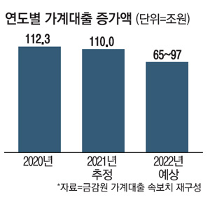 2일 금융당국 속보치와 전망을 종합하면 2021년 말 기준 가계대출 잔액은 1628조원대로 추정된다. 2020년 말 잔액보다 110조원(7.2%) 정도 증가했다. 금융위원회 관계자는 "아직 연말 기준 집계가 나오지 않았지만 지난달 가계대출 잔액 증가액은 전달(작년 11월)의 절반에 못 미치는 규모로 예상한다"고 말했다. 작년 11월 금융감독원 속보치 기준 가계대출 증가액은 5조9000억원이다. 이에 따라 지난해 가계대출 증가율은 2020년보다 0.8%포인트가량 낮아질 것으로 보인다. 2020년에는 가계대출이 112조3000억원(8.0%) 증가했다.