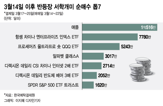 기술주가 바닥을 친 지난 14일부터 22일까지 서학개미는 애플을 1억516만달러 순매수했다.