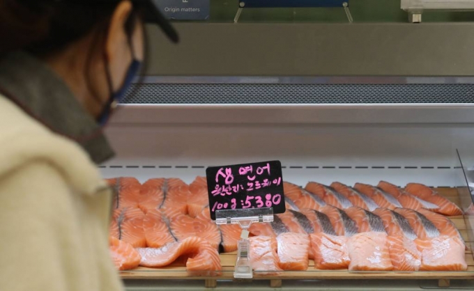 | [서울=뉴시스] 권창회 기자 = 15일 오후 서울 시내 마트에서 노르웨이산 연어를 판매하고 있다. 2023.01.15. |